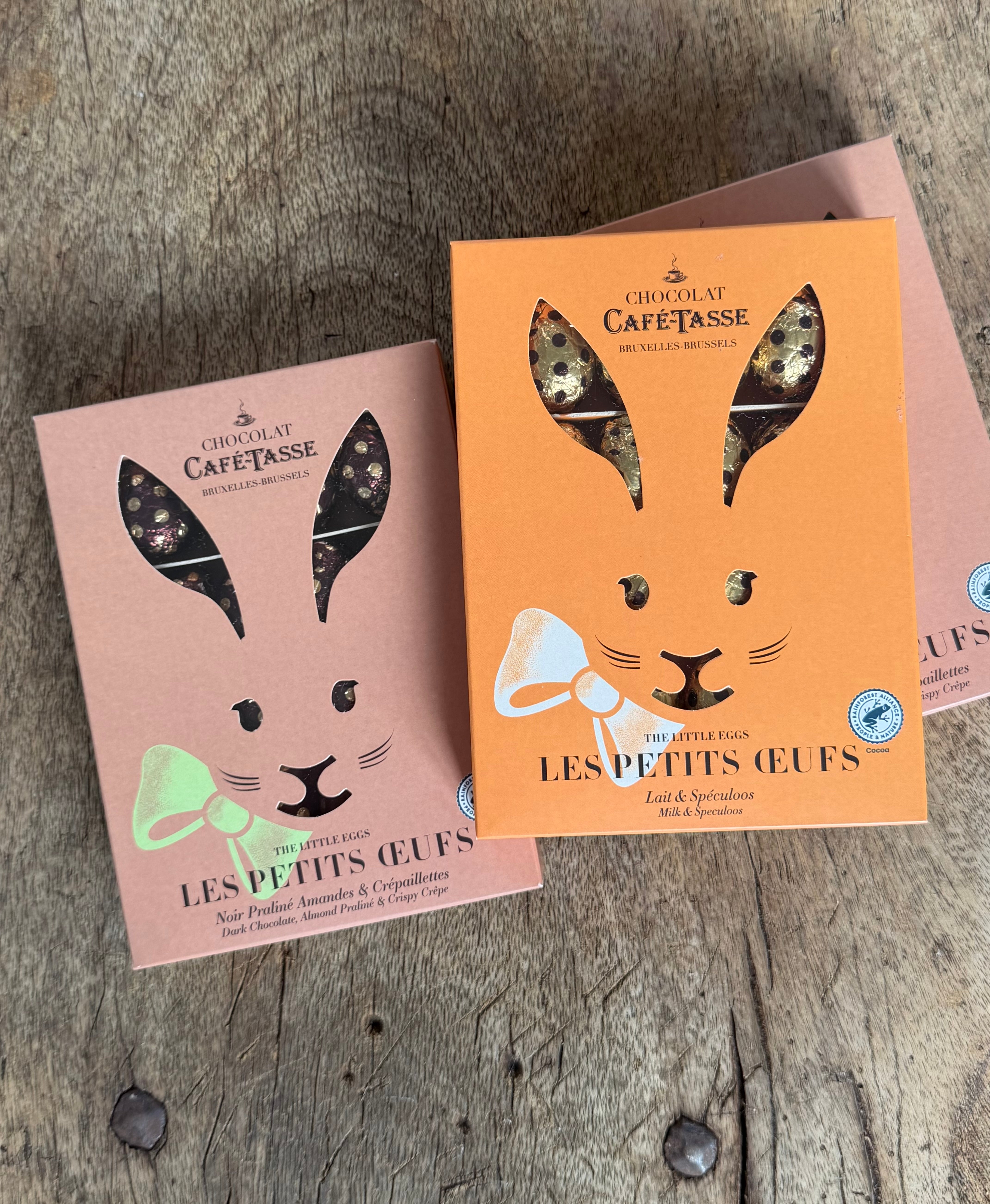 cut out rabbit boxes filled with the finest belgian foil wrapped praline chocolate eggs.