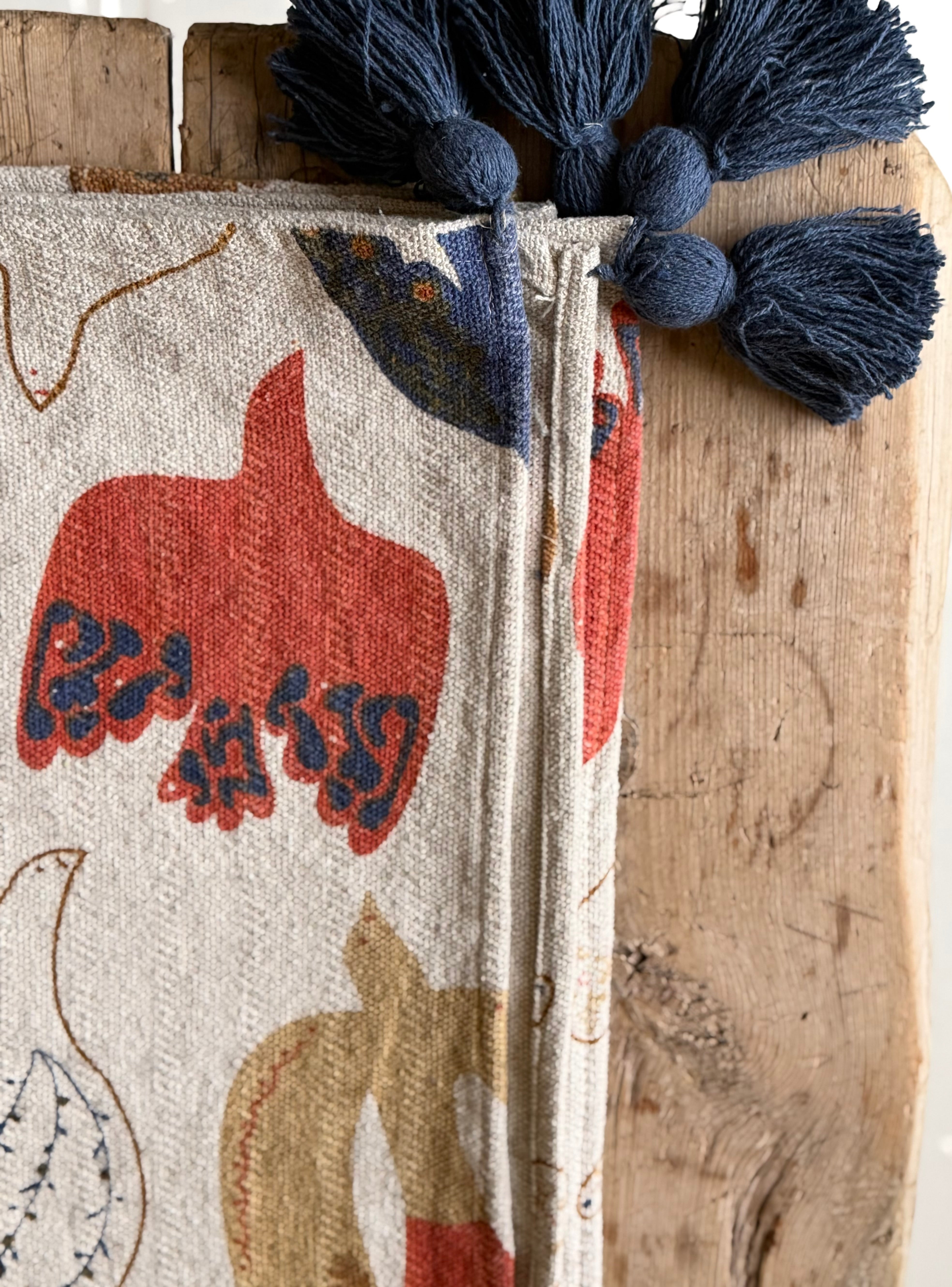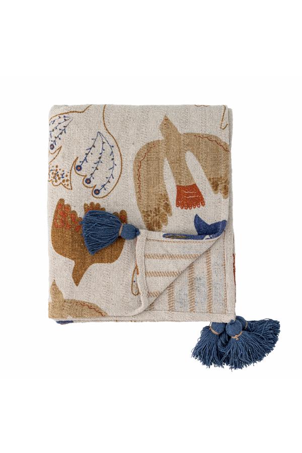 recycled cotton blend throw with blue tassels and colourful bird print