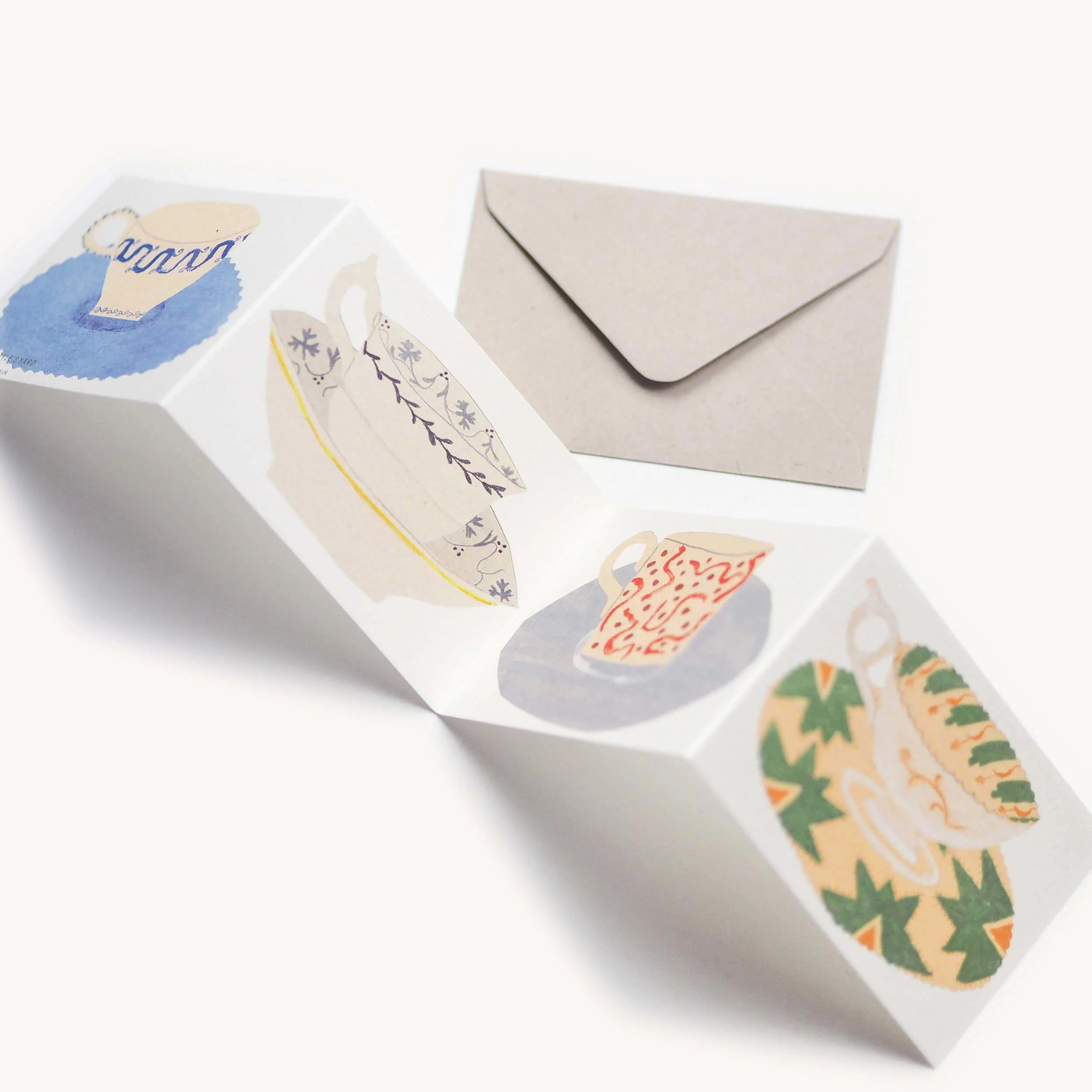 each tea cup concertina card has three folds and measures 7.5cm x 10cm when folded. the inside is left blank for your own message