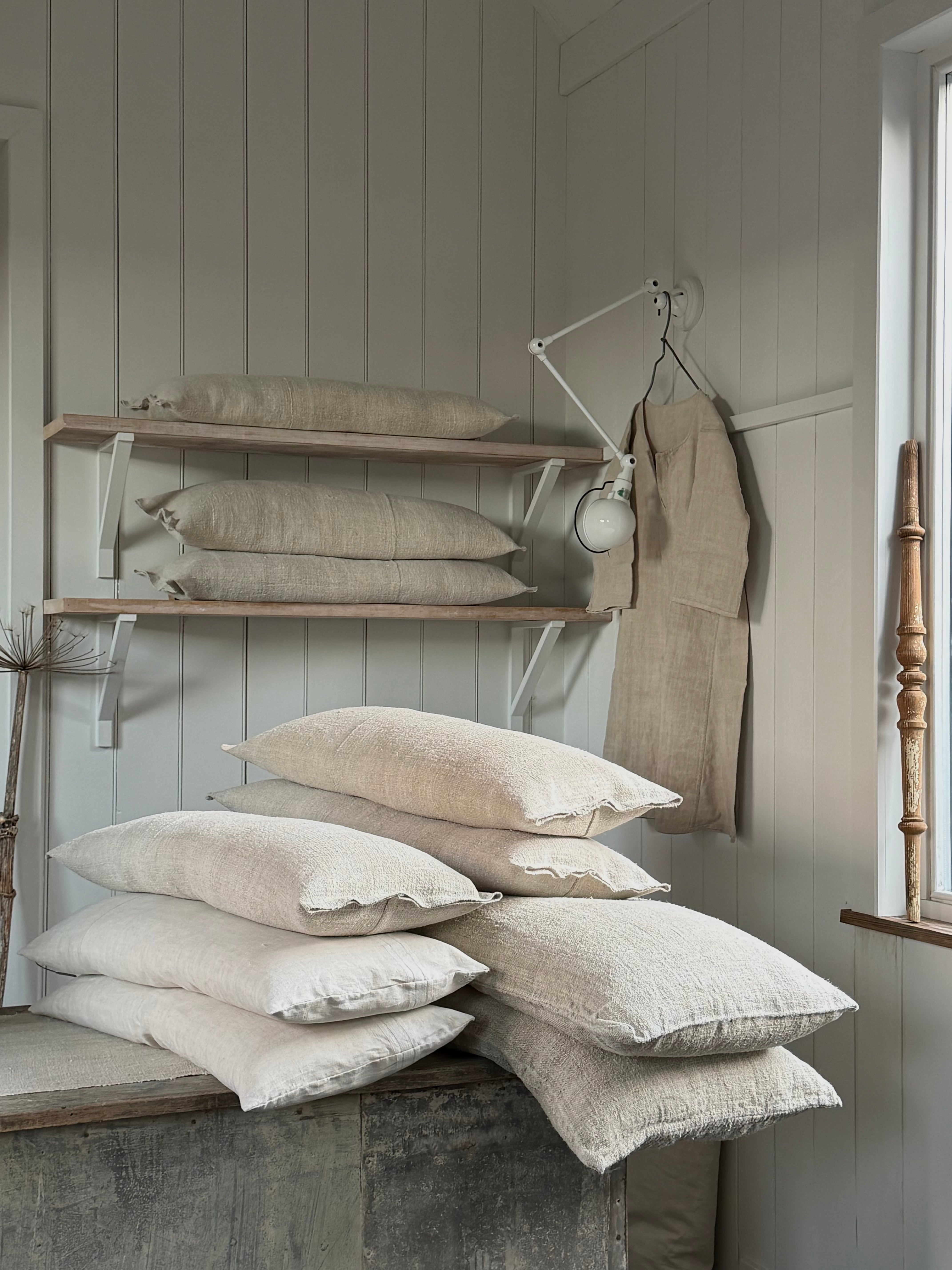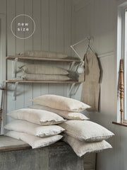 our antique linen grain sack cushions come with a comfortable feather fill. we search far and wide for sacks like these with their wonderful slubby texture. we wash and iron them, have individual duck feather cushions made to fit and finally Pippa hand finishes them in our workroom.