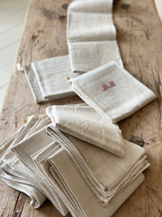 antique french linen tea towels, finished by hand with red embroidered monogram DB or red stripe design