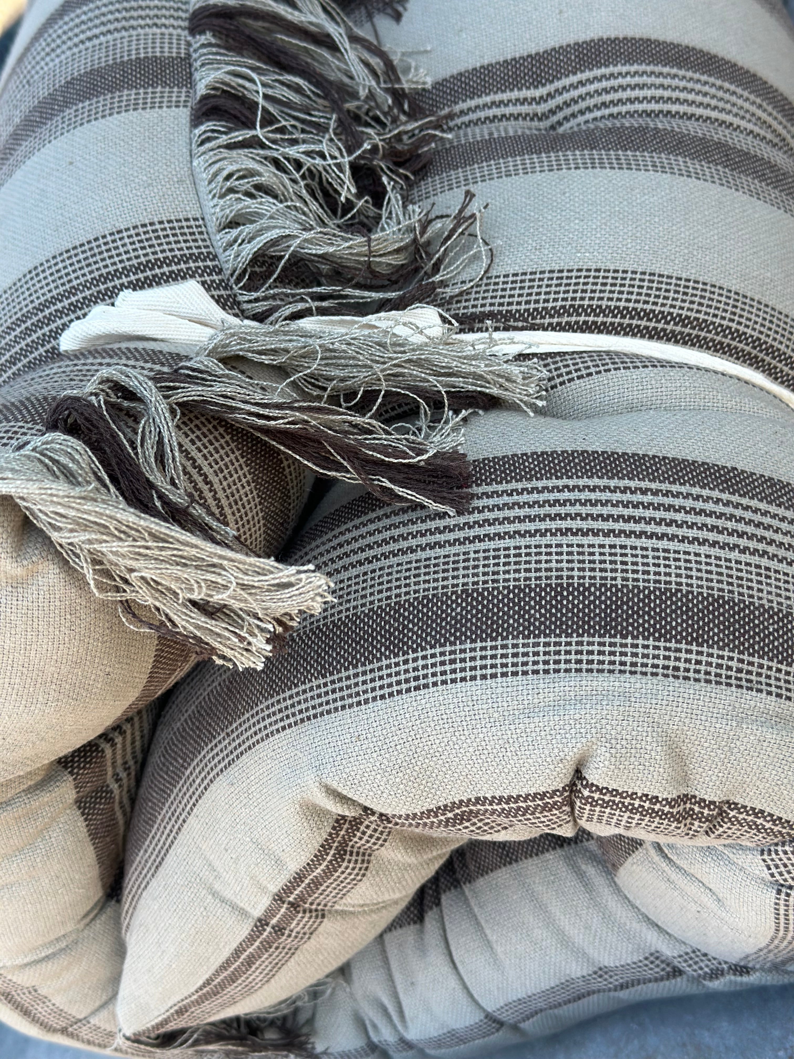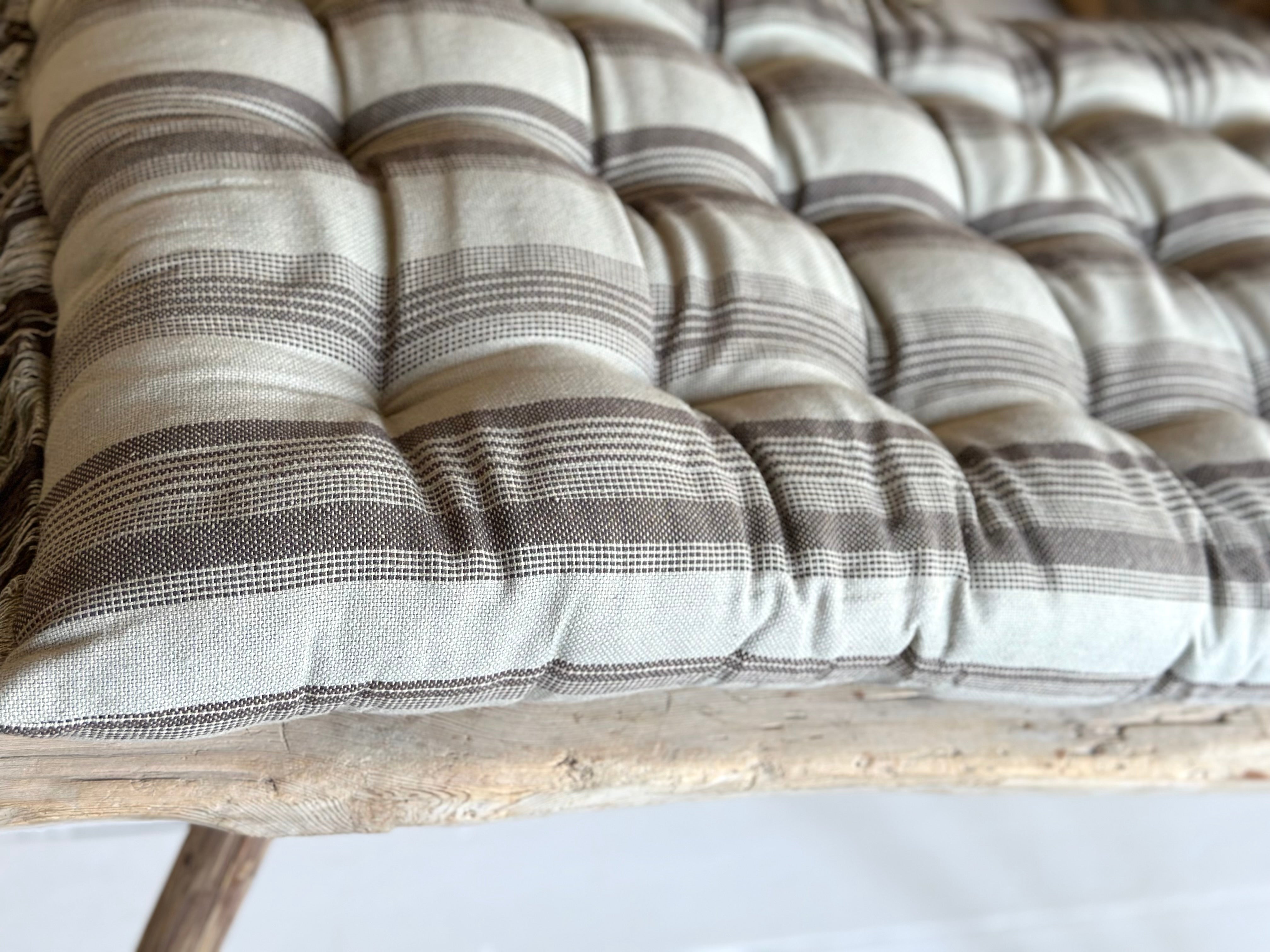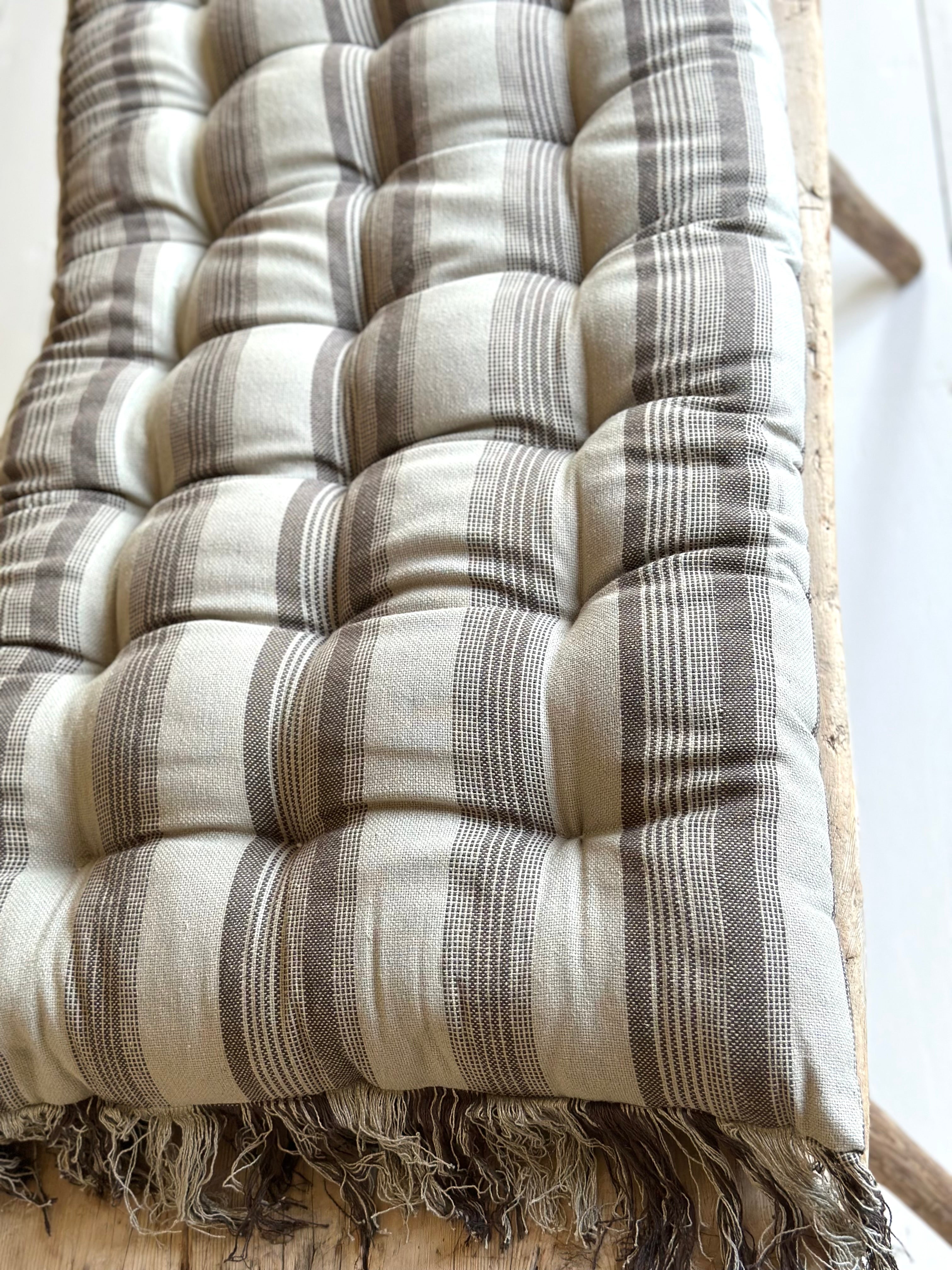 thick striped tufted mattress with fringed ends, filled with cotton fabric remnants.