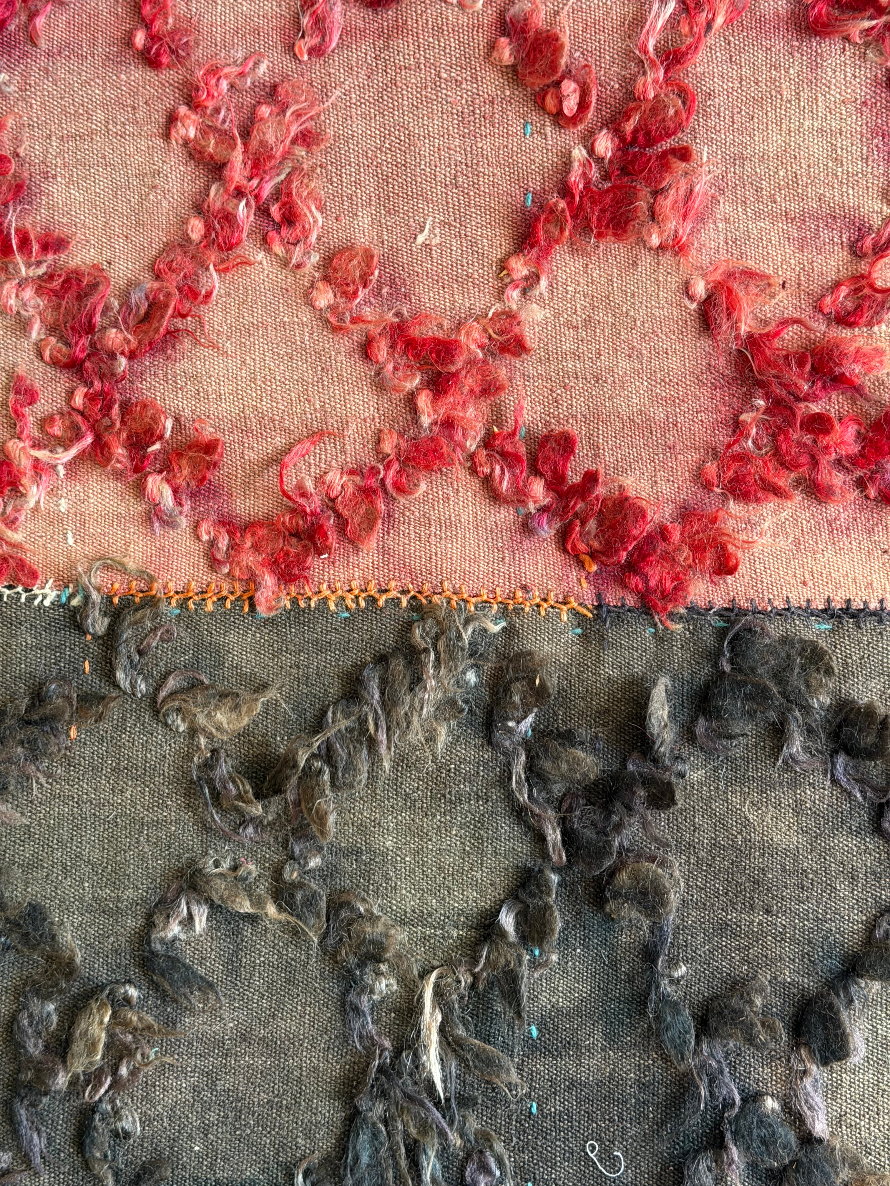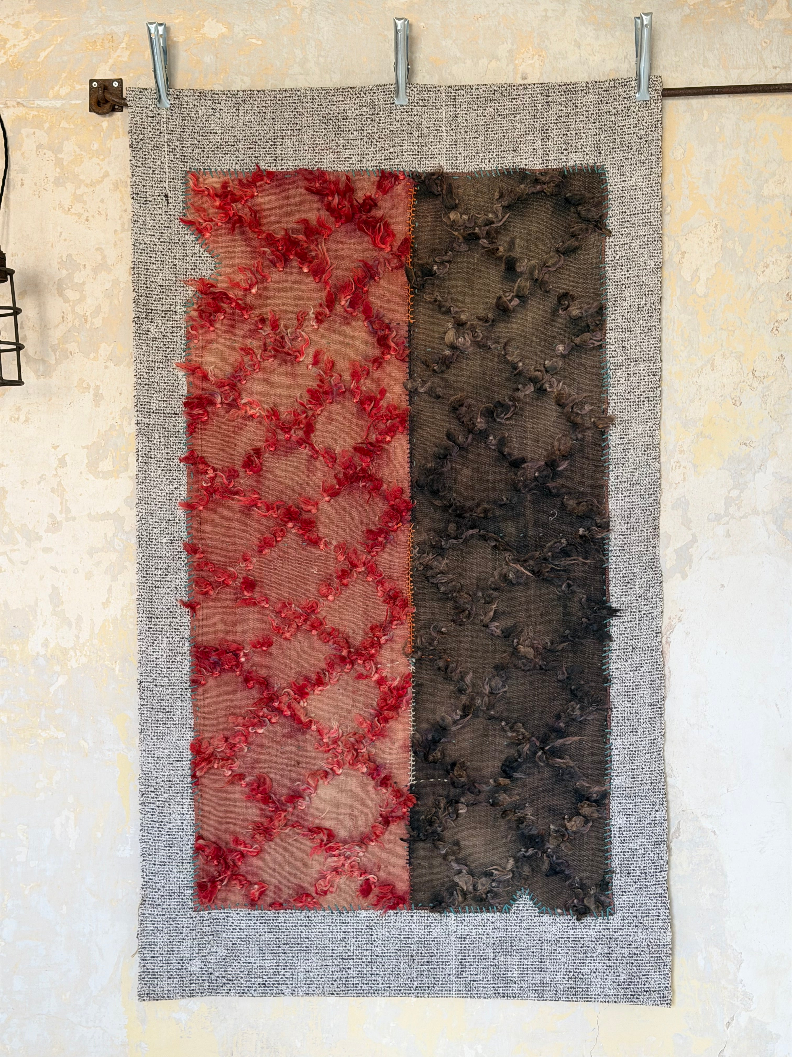 handwoven fragments have been handstitched onto woven wool panels, creating a unique artwork with visible stitching and mending — adding to the individual beauty of each piece