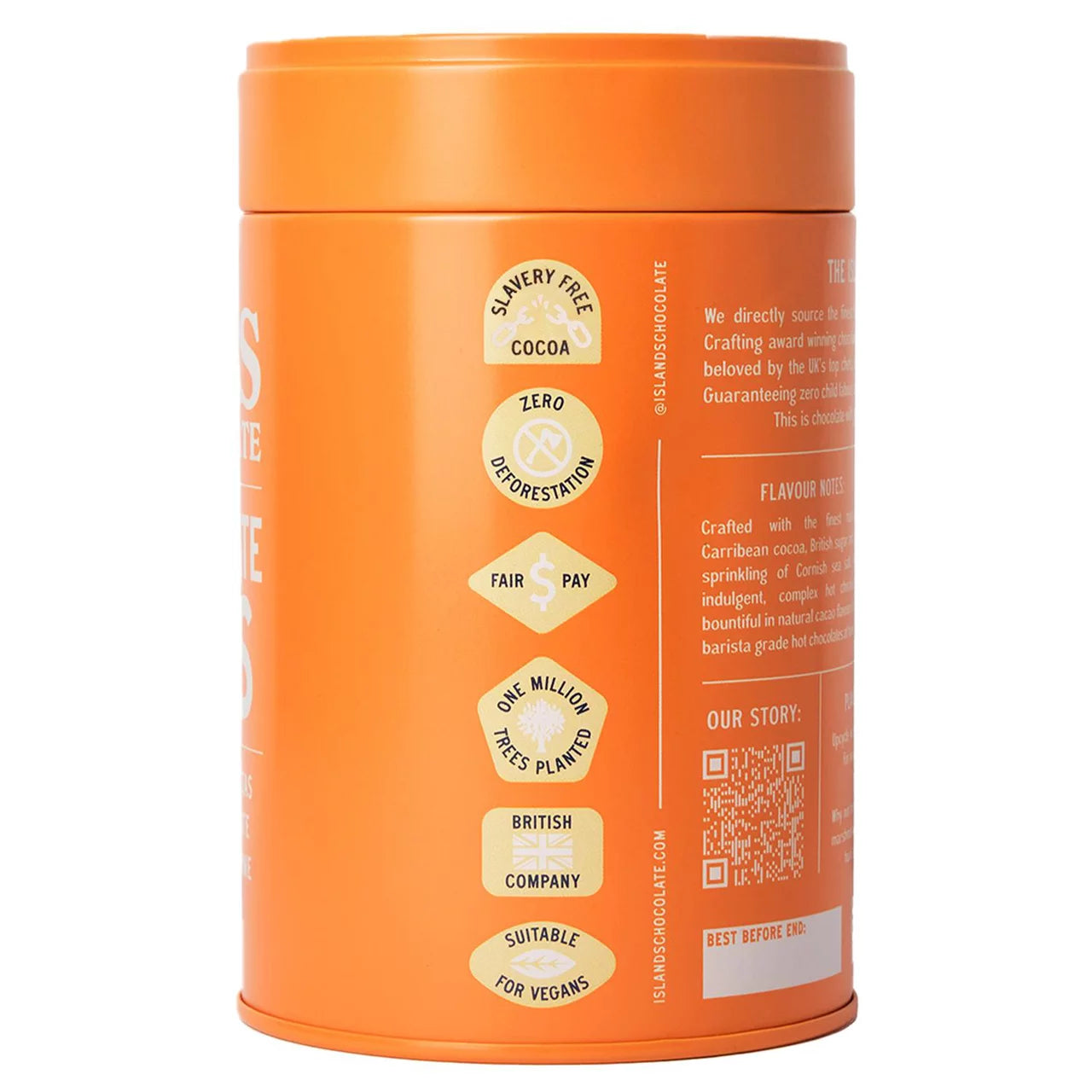 vegan friendly 55% dark hot chocolate flakes in a metal tin. an indulgently, luxurious hot chocolate like no other. notes of rich caramel, zesty orange and cream are expertly complemented by deep cocoa flavours for barista grade hot chocolates at home.