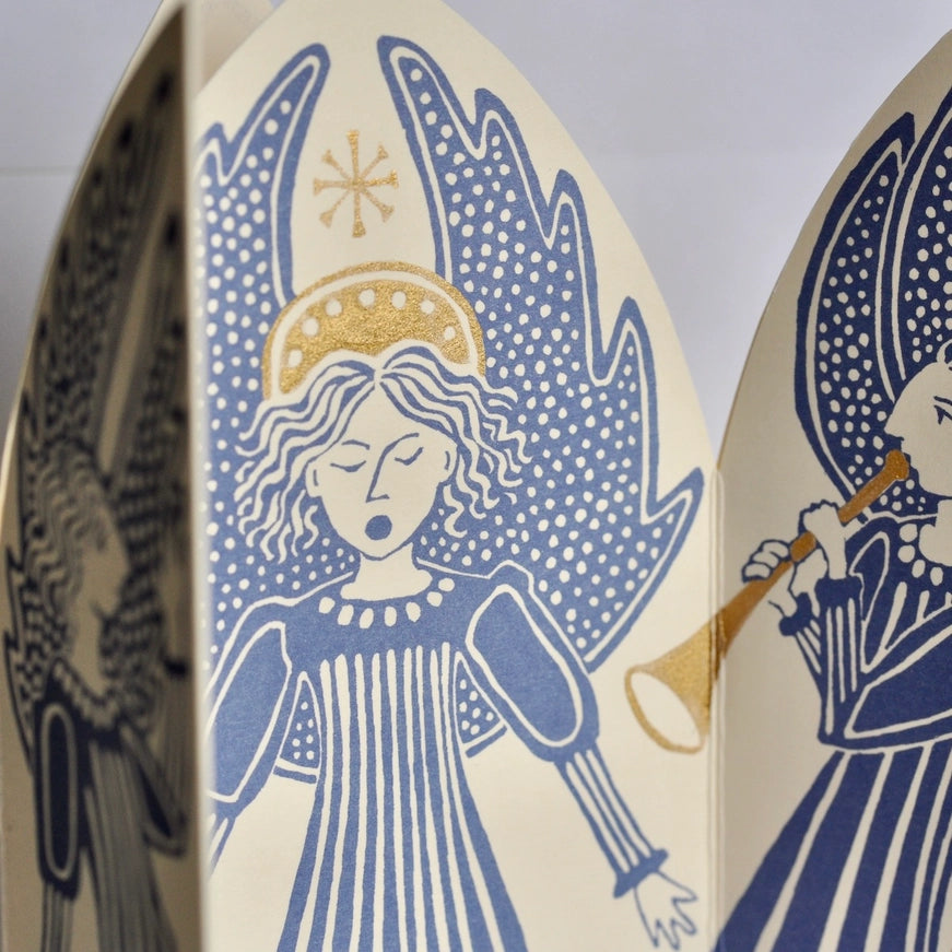 a festive three-dimensional triptych card, printed in england on 300gsm smooth ivory card using vegetable oil based ink that is friendly to the environment