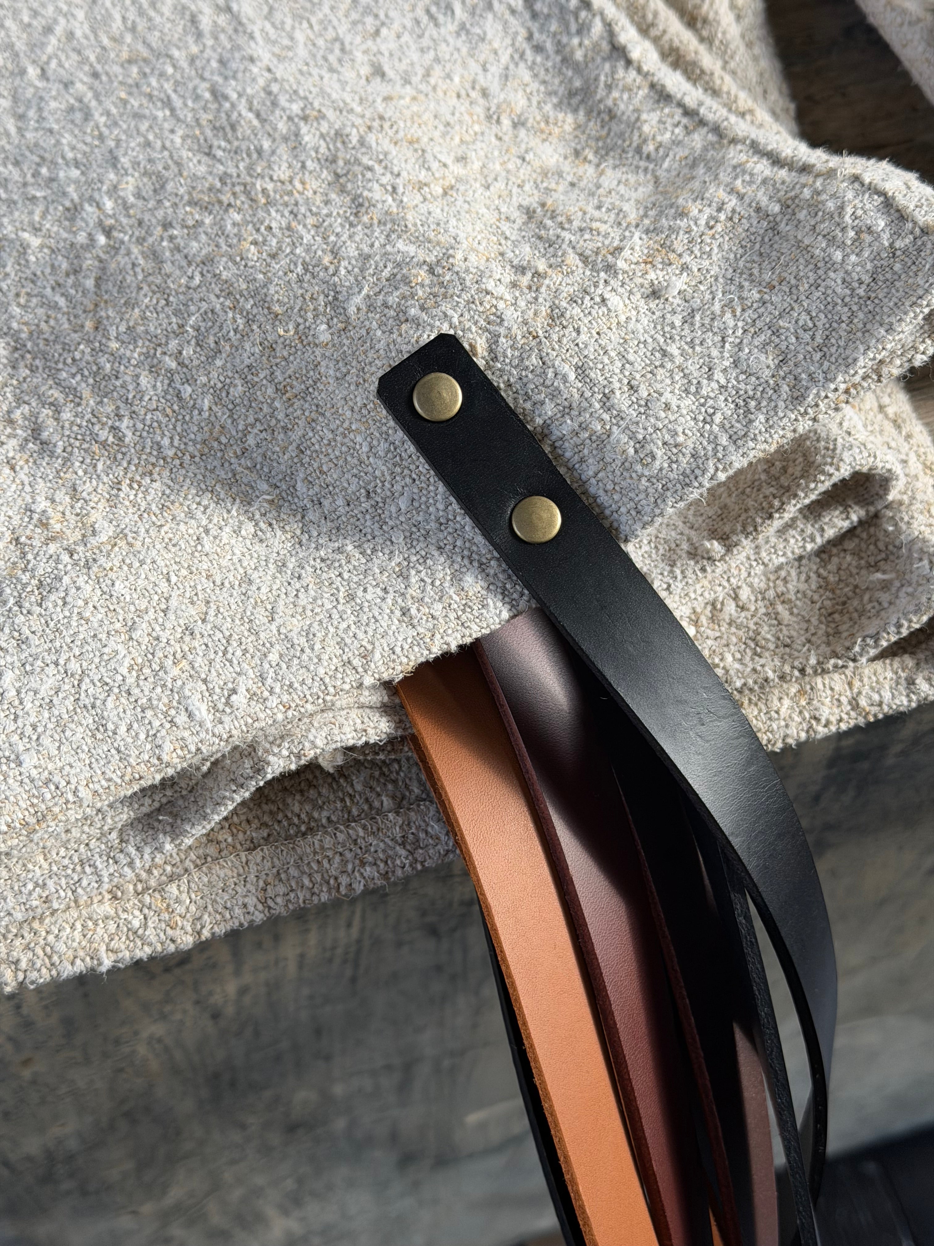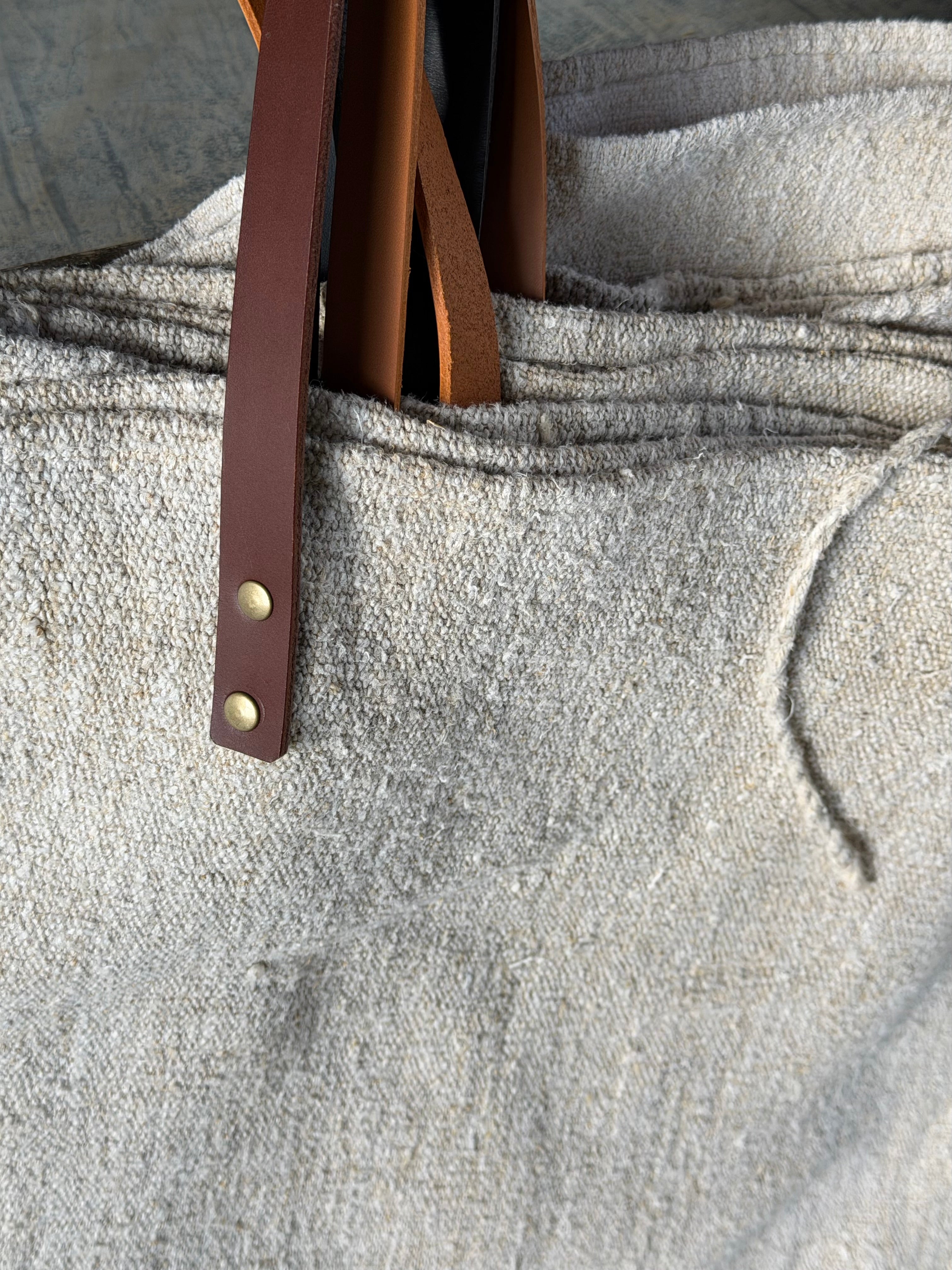 tote bags made by Pippa in our workroom using old linen grain sacks with thick leather straps in a choice of 3 colours