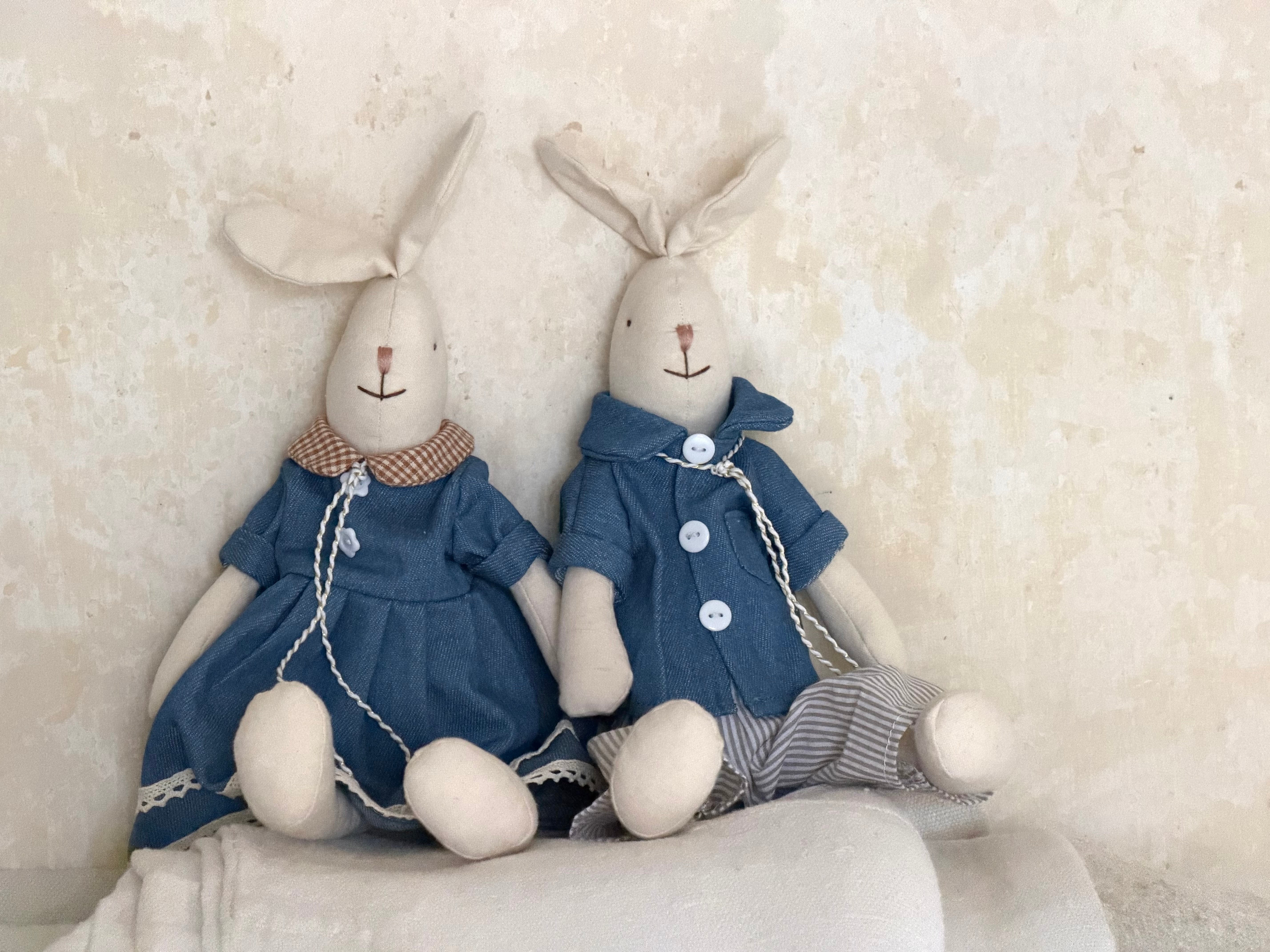 adorable cuddly brother and sister rabbits with gorgeous blue outfits with contrast buttons