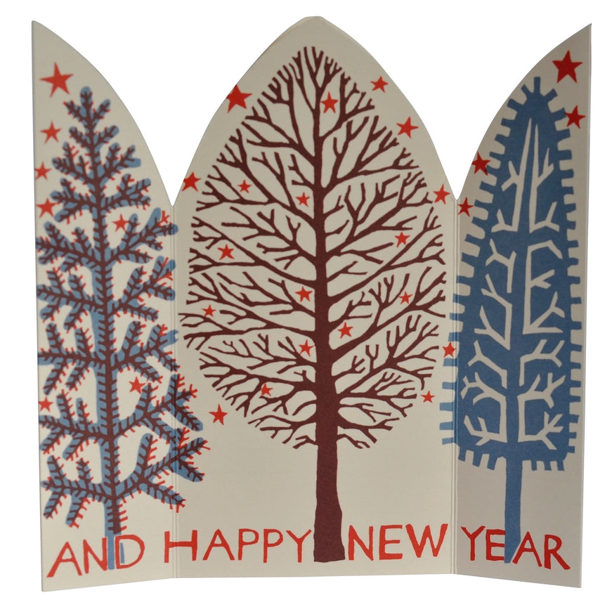 a festive three-dimensional triptych card, printed in england on 300gsm smooth ivory card using vegetable oil based ink that is friendly to the environment